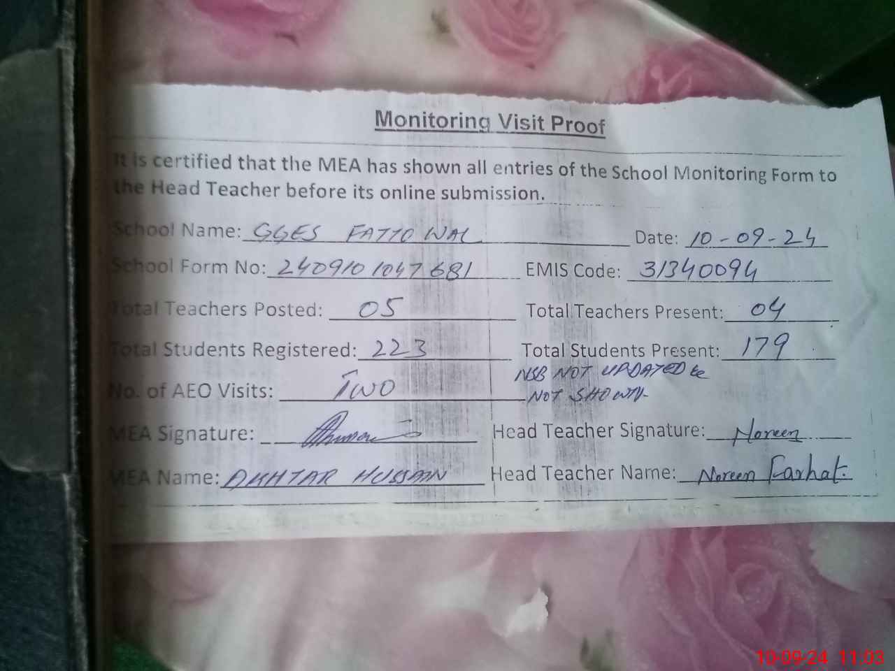 | Name: No**** Fa**** Designation: (School Headmaster's/Headmistress's) EST SCI Phone/Cell Number: 03**** |