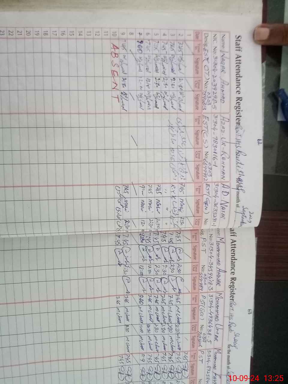| CNIC | Full Name | Designation | R/C | Absence during last cal. month |