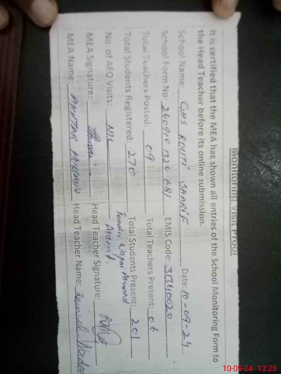 | Attendance Register | Head Teacher | MEA with School | Visit Proof |
