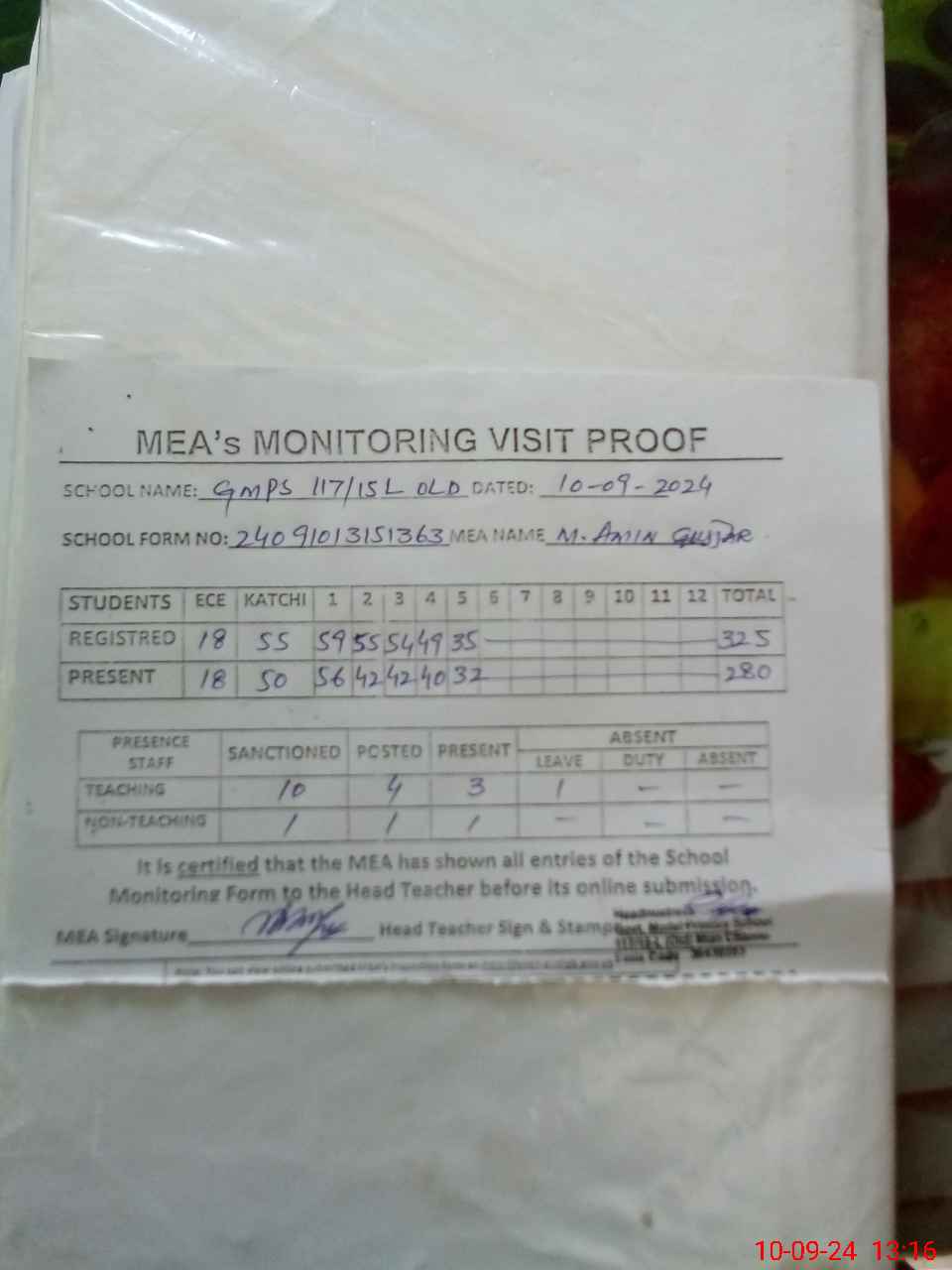 | Certified that this School was Inspected by the Undersigned MEA/DMO Today and the Information Stated Above is as Per Record. | |||||