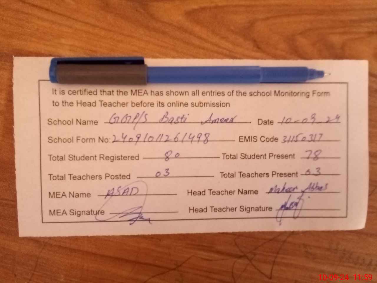 | Certified that this School was Inspected by the Undersigned MEA/DMO Today and the Information Stated Above is as Per Record. | |||||