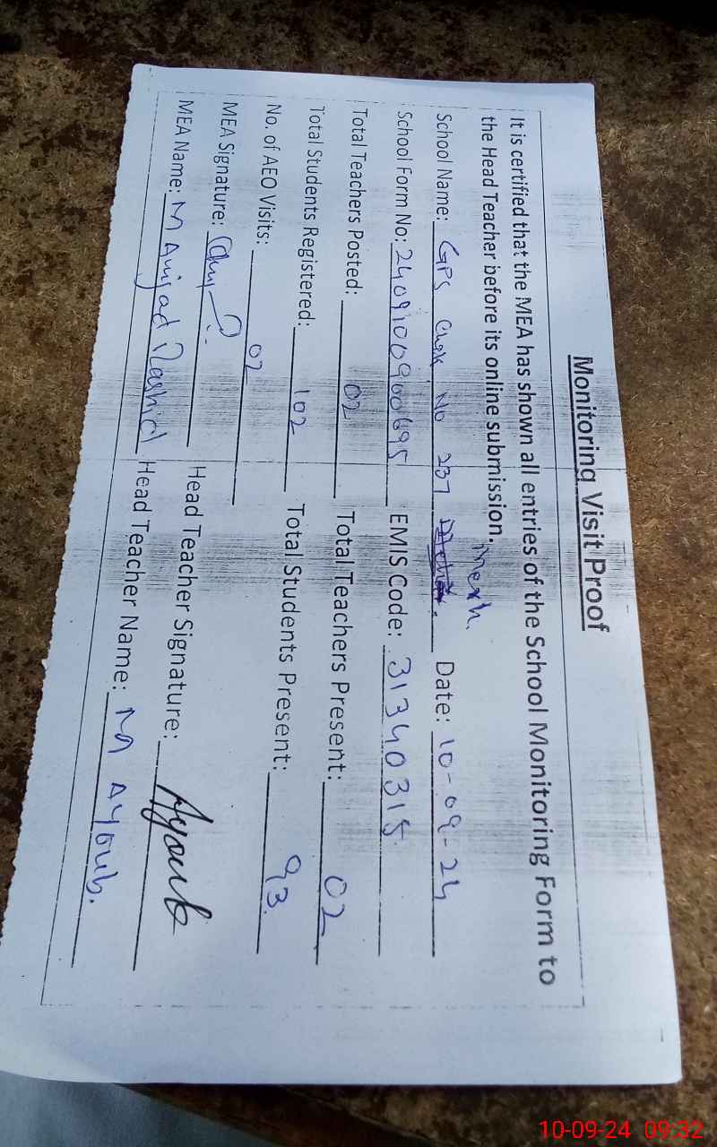 | Attendance Register | Head Teacher | MEA with School | Visit Proof |
