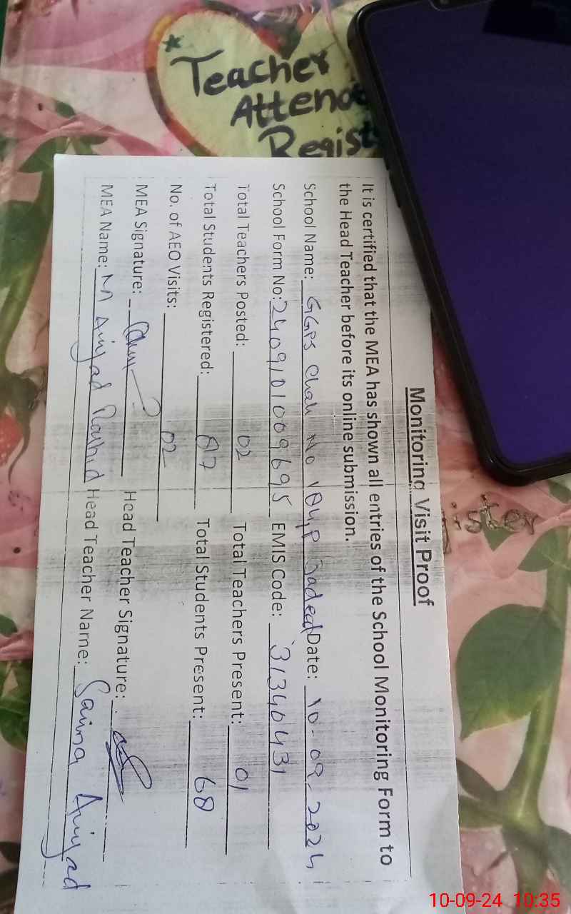 | Attendance Register | Head Teacher | MEA with School | Visit Proof |