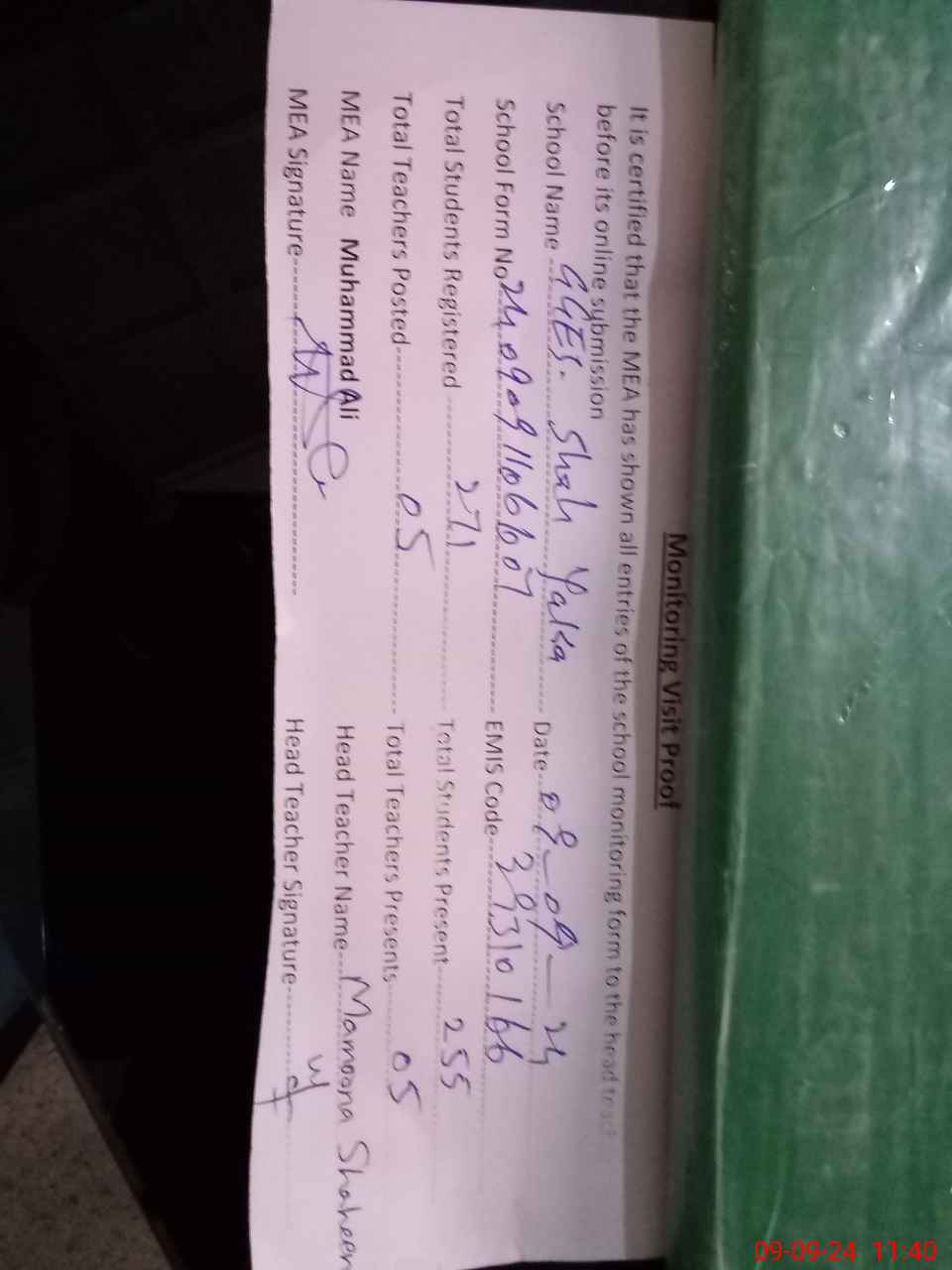 | Attendance Register | Head Teacher | MEA with School | Visit Proof |