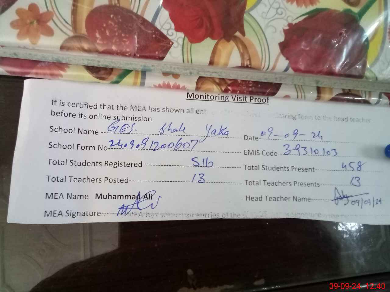 | Attendance Register | Head Teacher | MEA with School | Visit Proof |