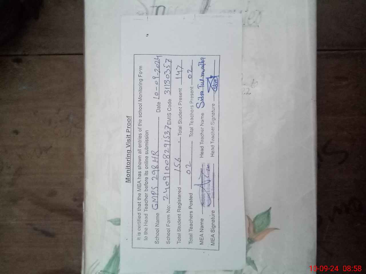| Attendance Register | Head Teacher | MEA with School | Visit Proof |