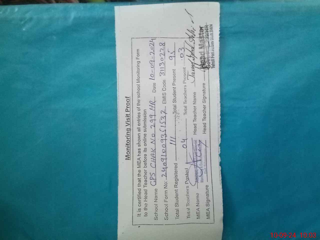 | Attendance Register | Head Teacher | MEA with School | Visit Proof |