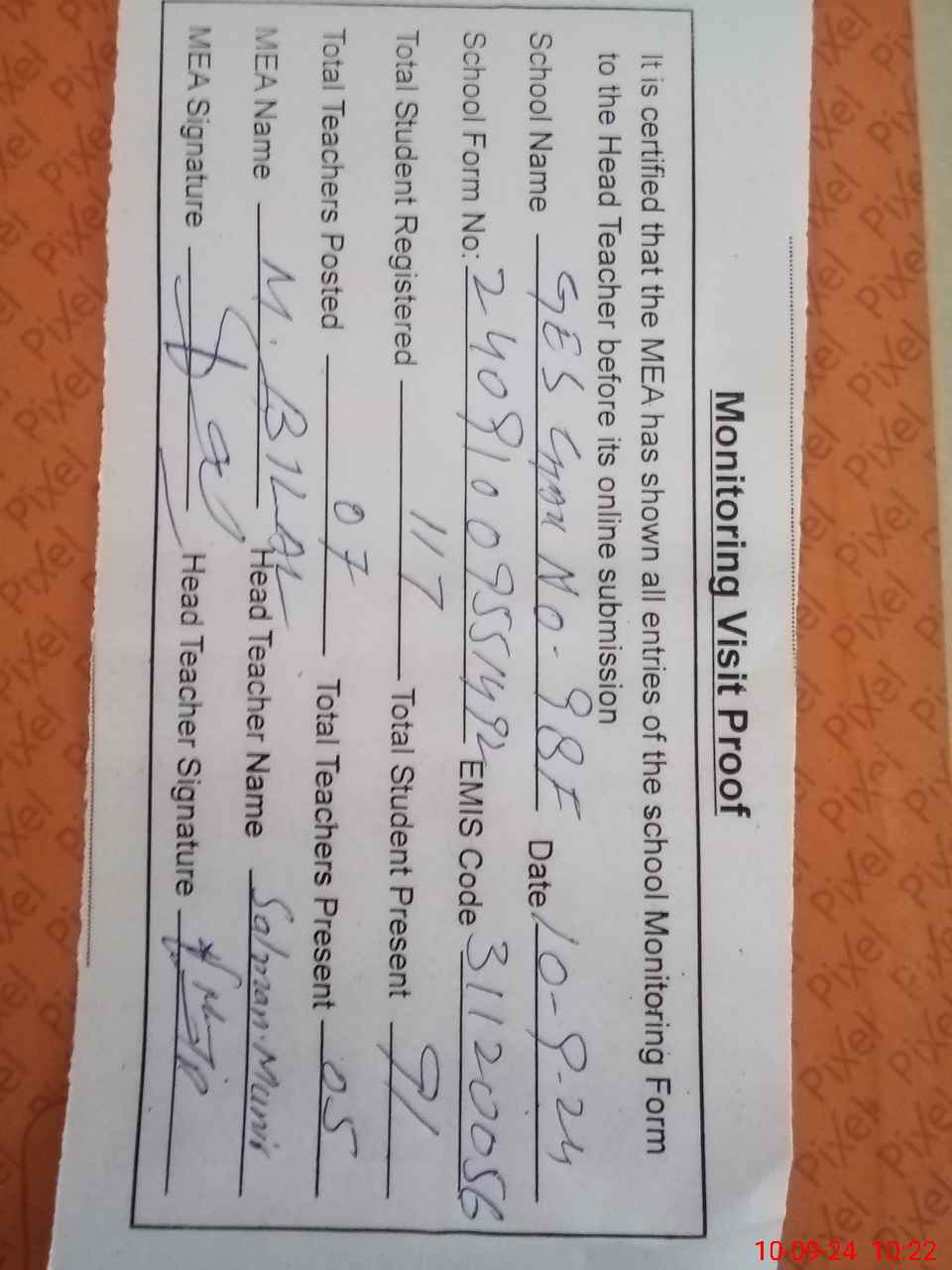 | Attendance Register | Head Teacher | MEA with School | Visit Proof |