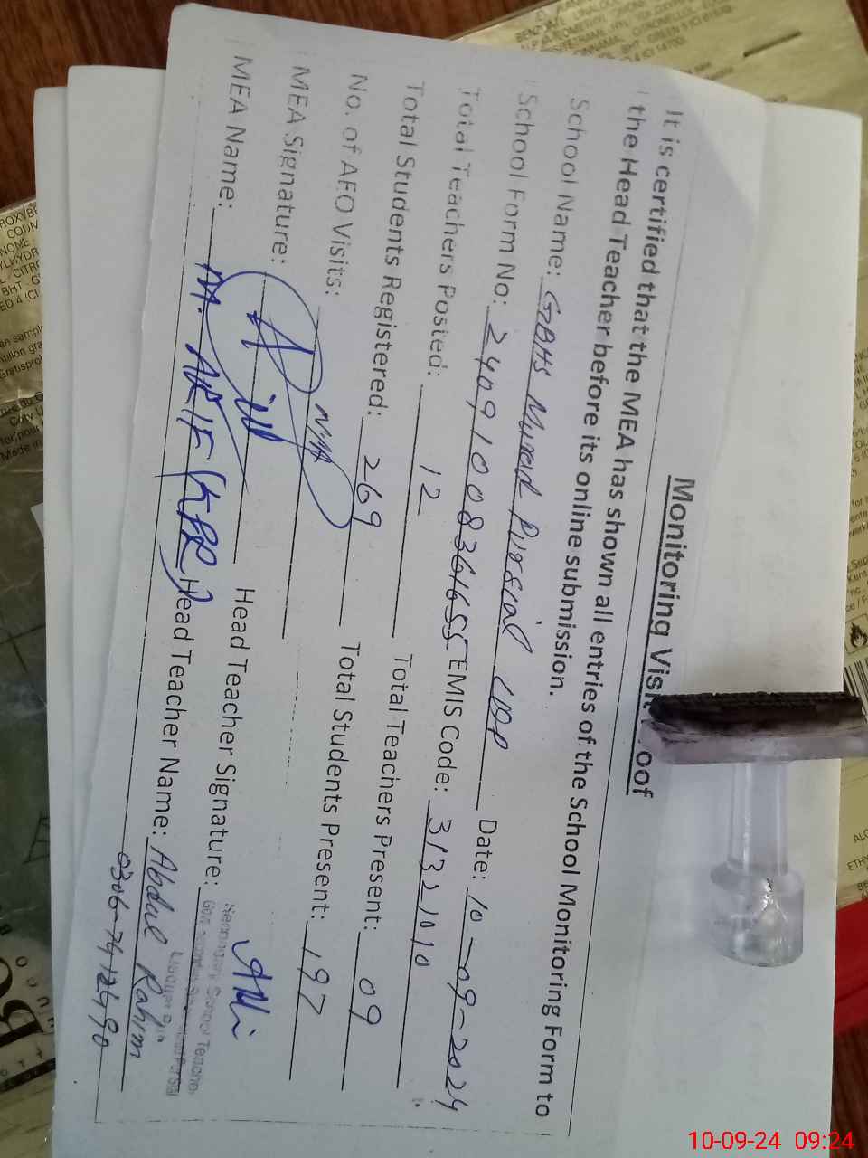 | Attendance Register | Head Teacher | MEA with School | Visit Proof |