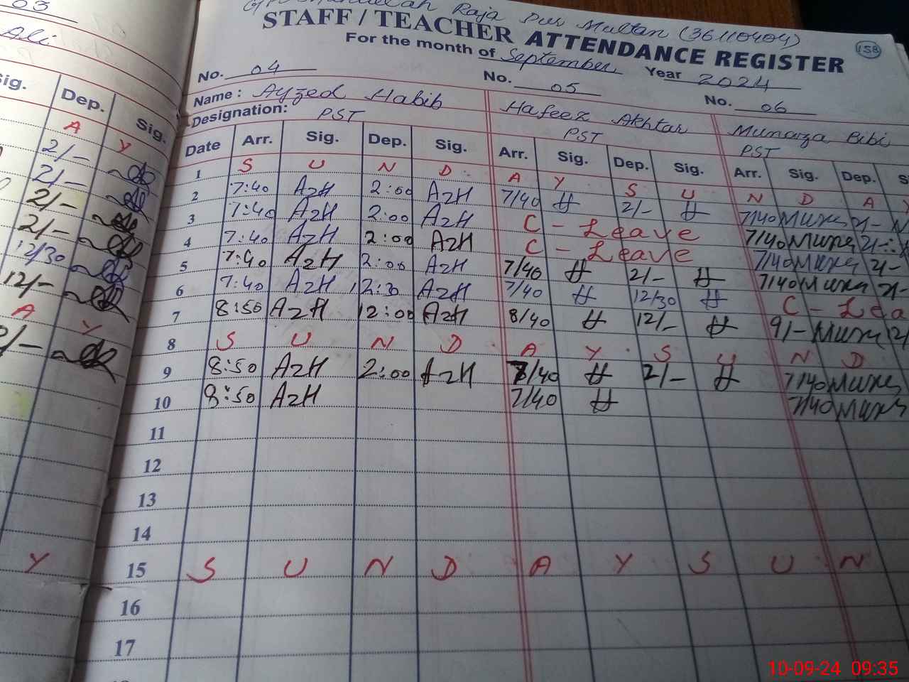 | CNIC | Full Name | Designation | R/C | Absence During Last Calender Month |