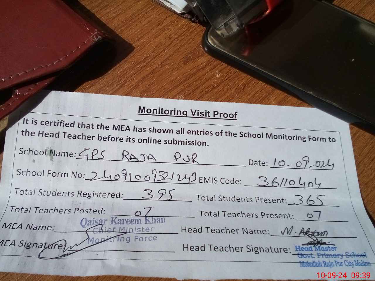 | Attendance Register | Head Teacher | MEA with School | Visit Proof |