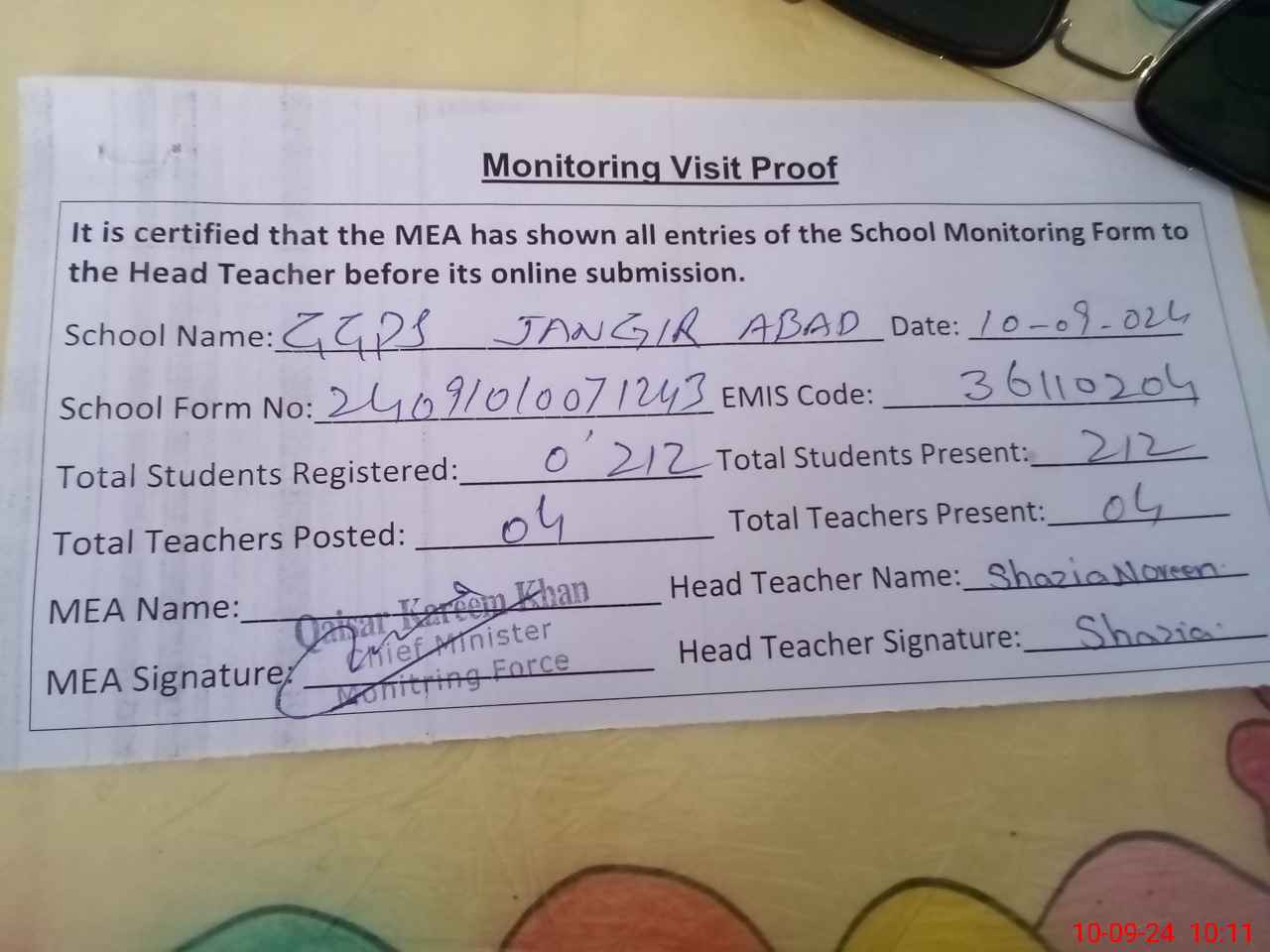 | Monitoring Date: 10-09-2024 | Start Time: 10-09-2024 09:55 AM | End Time: 10-09-2024 10:12 AM | Name of MEA: Qa**** Ka**** Kh**** | |
