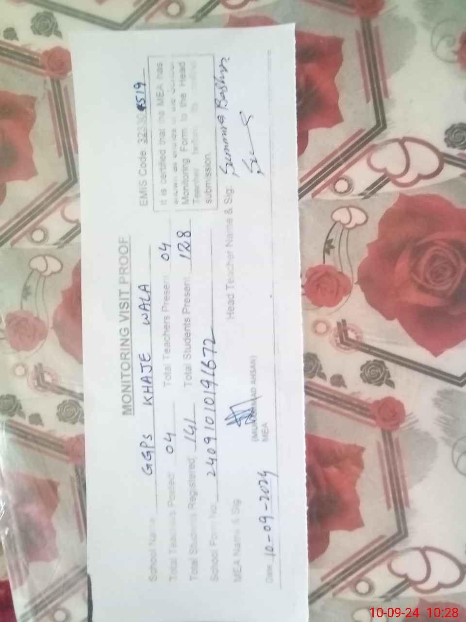 | Attendance Register | Head Teacher | MEA with School | Visit Proof |