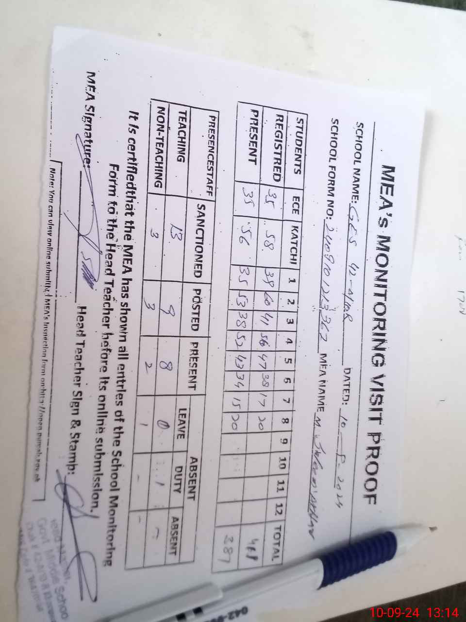 | Attendance Register | Head Teacher | MEA with School | Visit Proof |