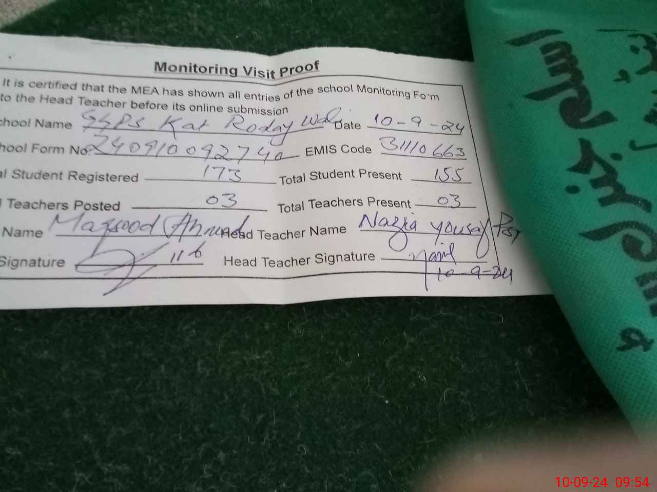 | Attendance Register | Head Teacher | MEA with School | Visit Proof |