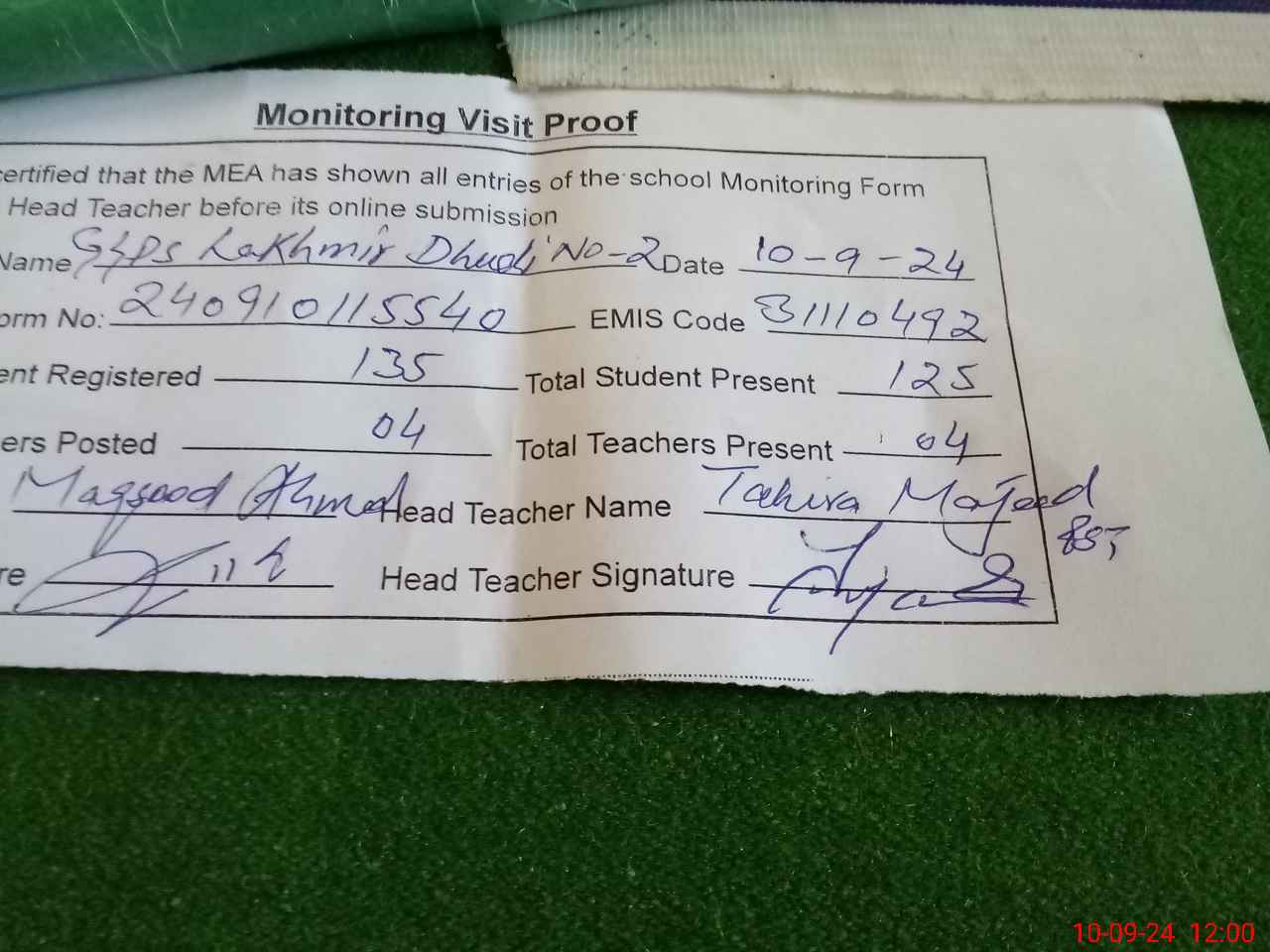 | Attendance Register | Head Teacher | MEA with School | Visit Proof |