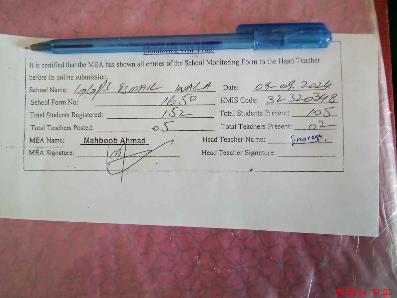 | Monitoring Date: 09-09-2024 | Start Time: 09-09-2024 10:33 AM | End Time: 09-09-2024 11:10 AM | Name of MEA: MA**** AH**** | |