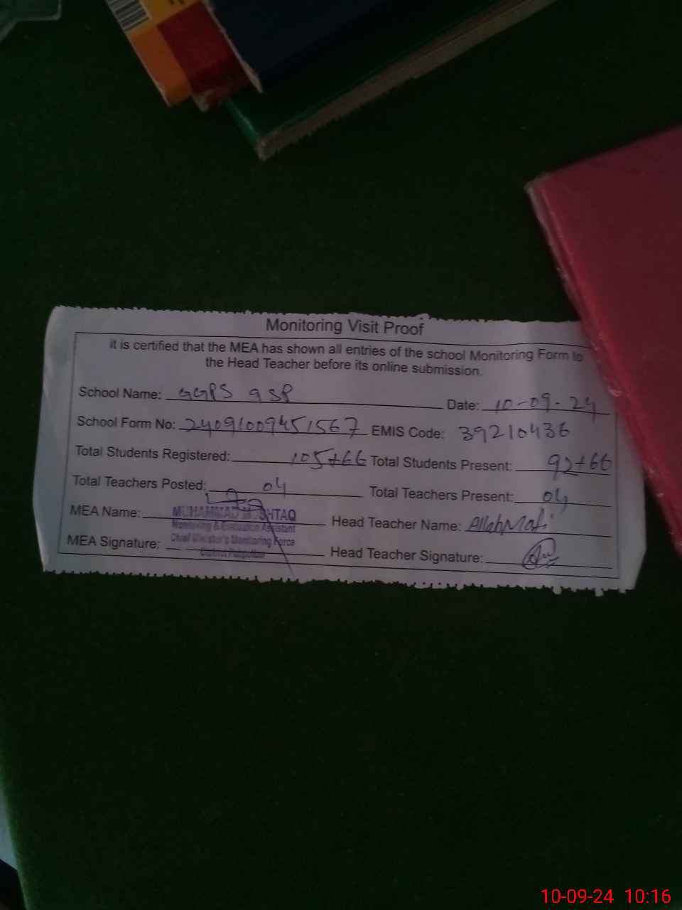 | Attendance Register | Head Teacher | MEA with School | Visit Proof |
