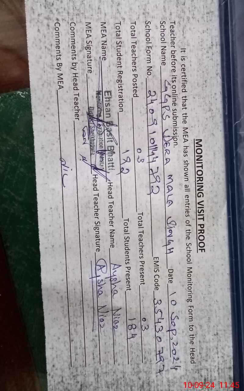 | Certified that this School was Inspected by the Undersigned MEA/DMO Today and the Information Stated Above is as Per Record. | |||||