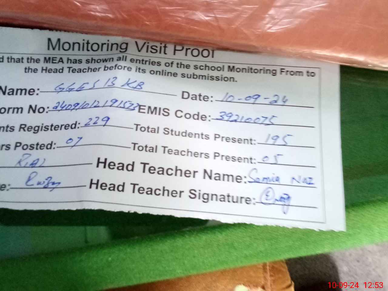 | Attendance Register | Head Teacher | MEA with School | Visit Proof |