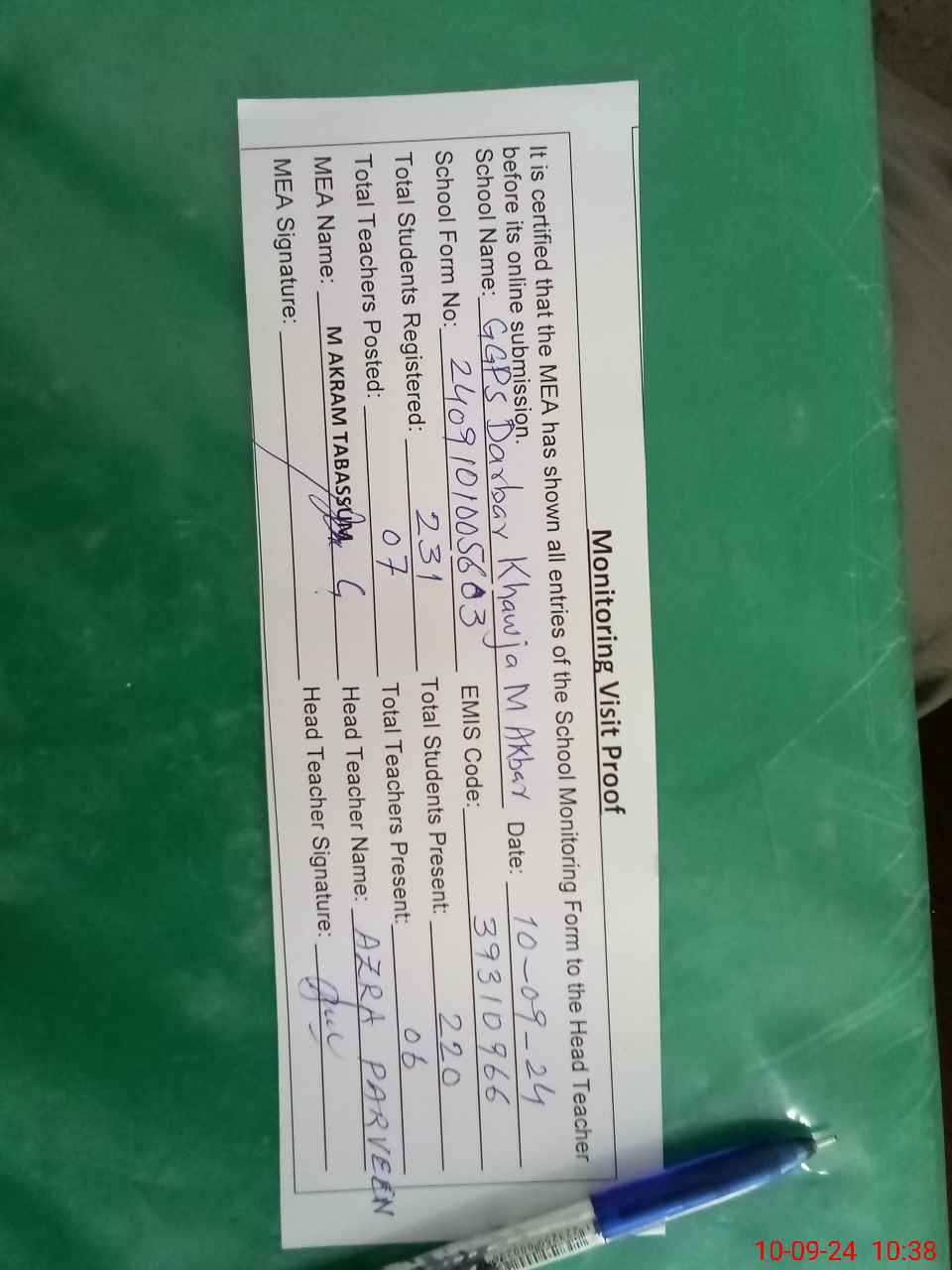 | Attendance Register | Head Teacher | MEA with School | Visit Proof |