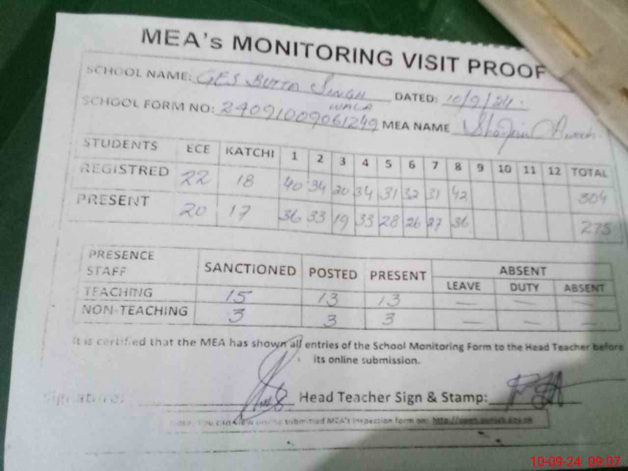 | Attendance Register | Head Teacher | MEA with School | Visit Proof |