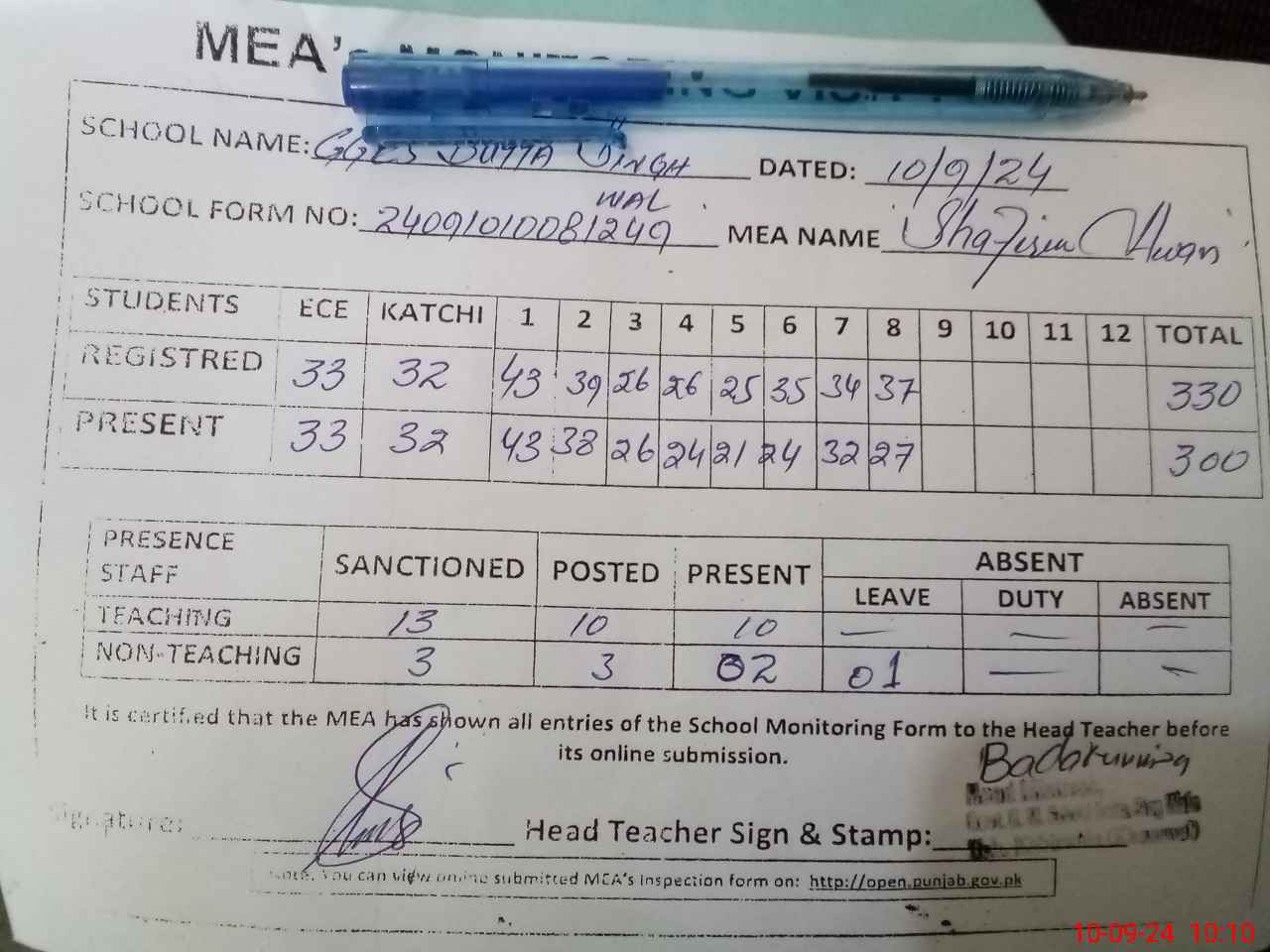 | Certified that this School was Inspected by the Undersigned MEA/DMO Today and the Information Stated Above is as Per Record. | |||||