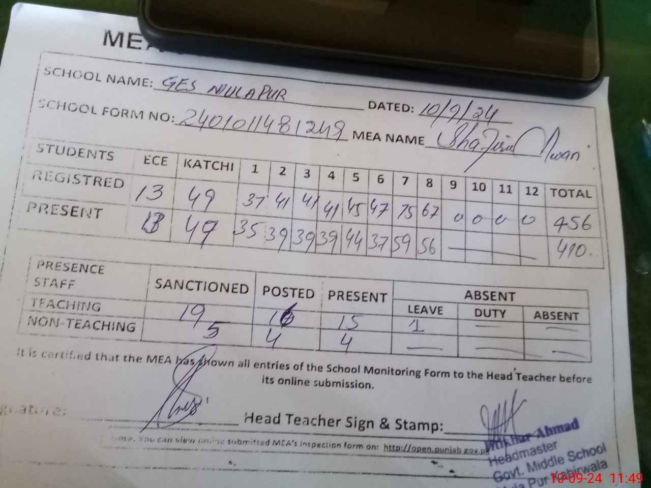 | Name: IF**** AH**** Designation: (School Headmaster's/Headmistress's) S.S.T.(G) Phone/Cell Number: 03**** |