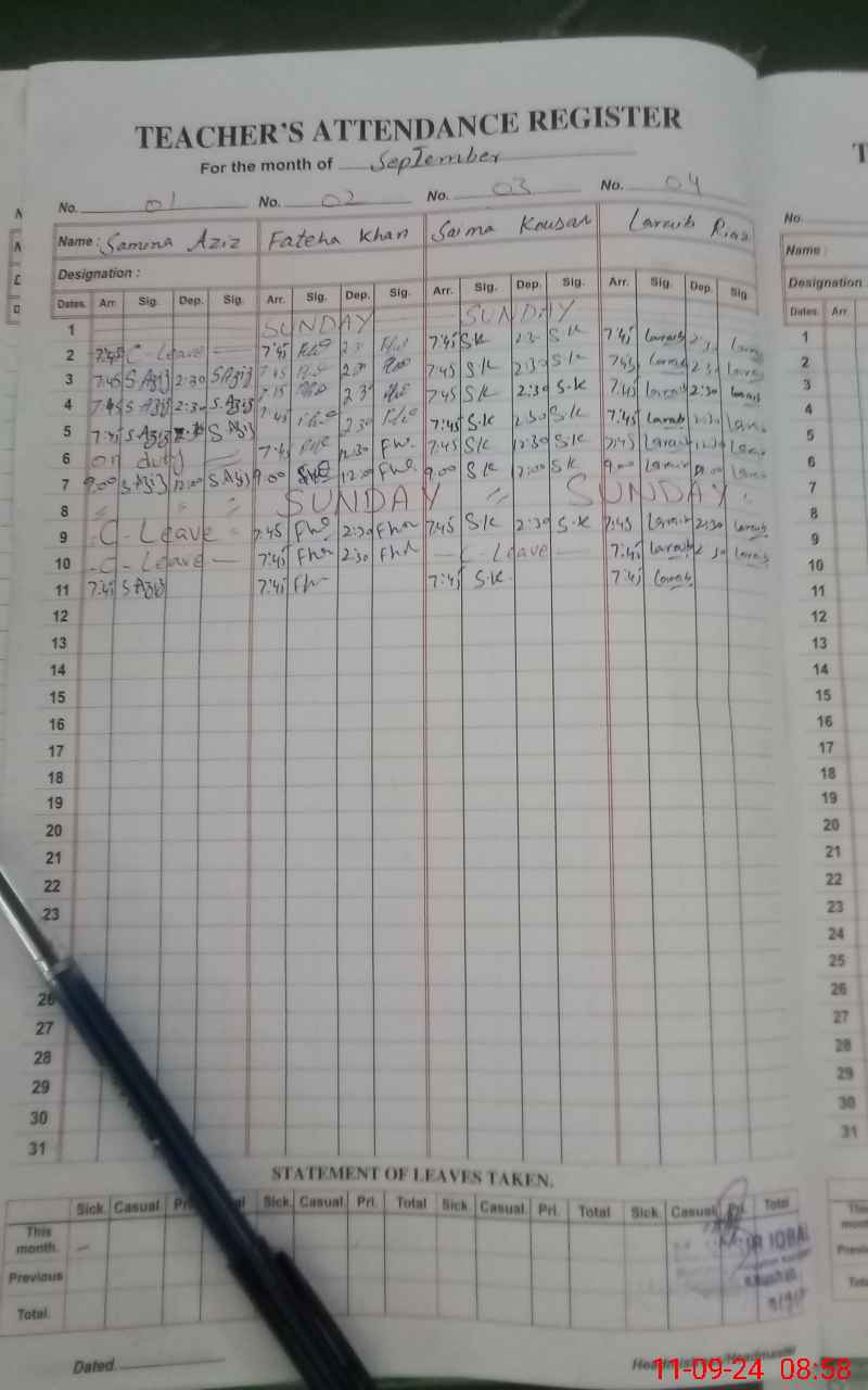 | CNIC | Full Name | Designation | R/C | Absence During Last Calender Month |