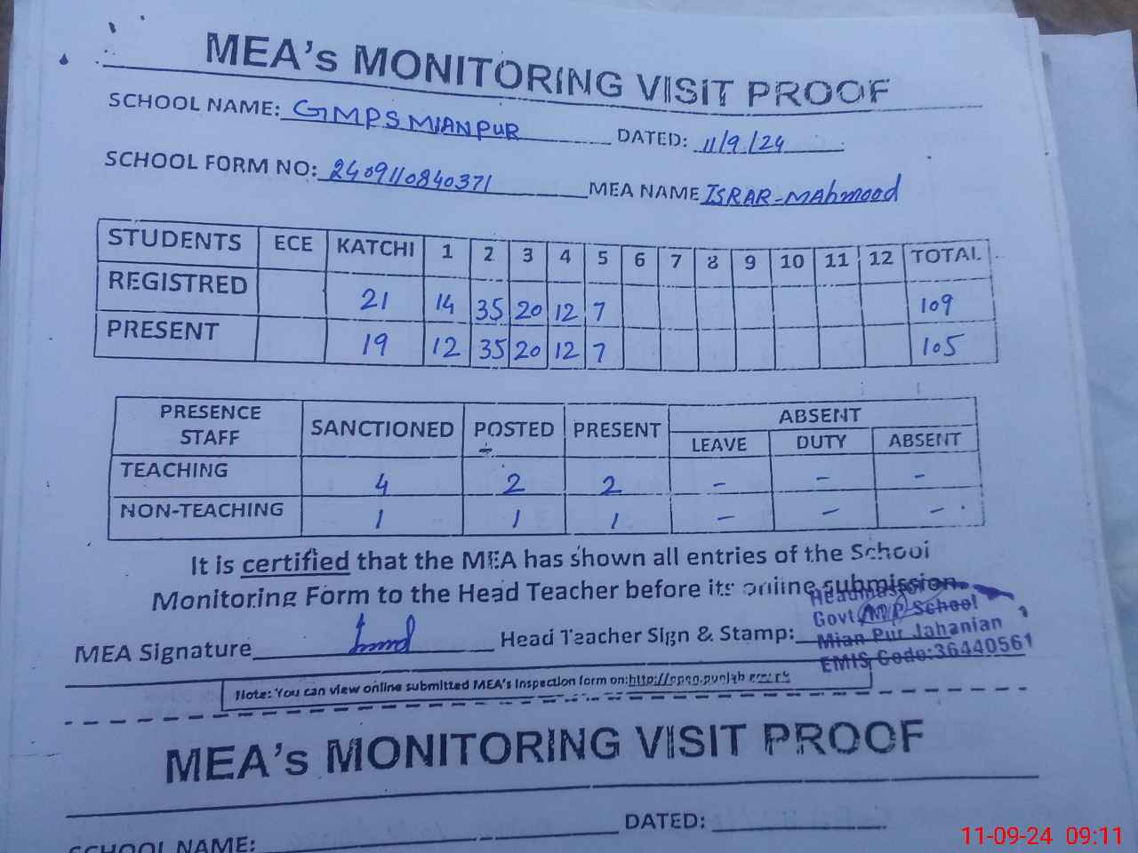 | Attendance Register | Head Teacher | MEA with School | Visit Proof |