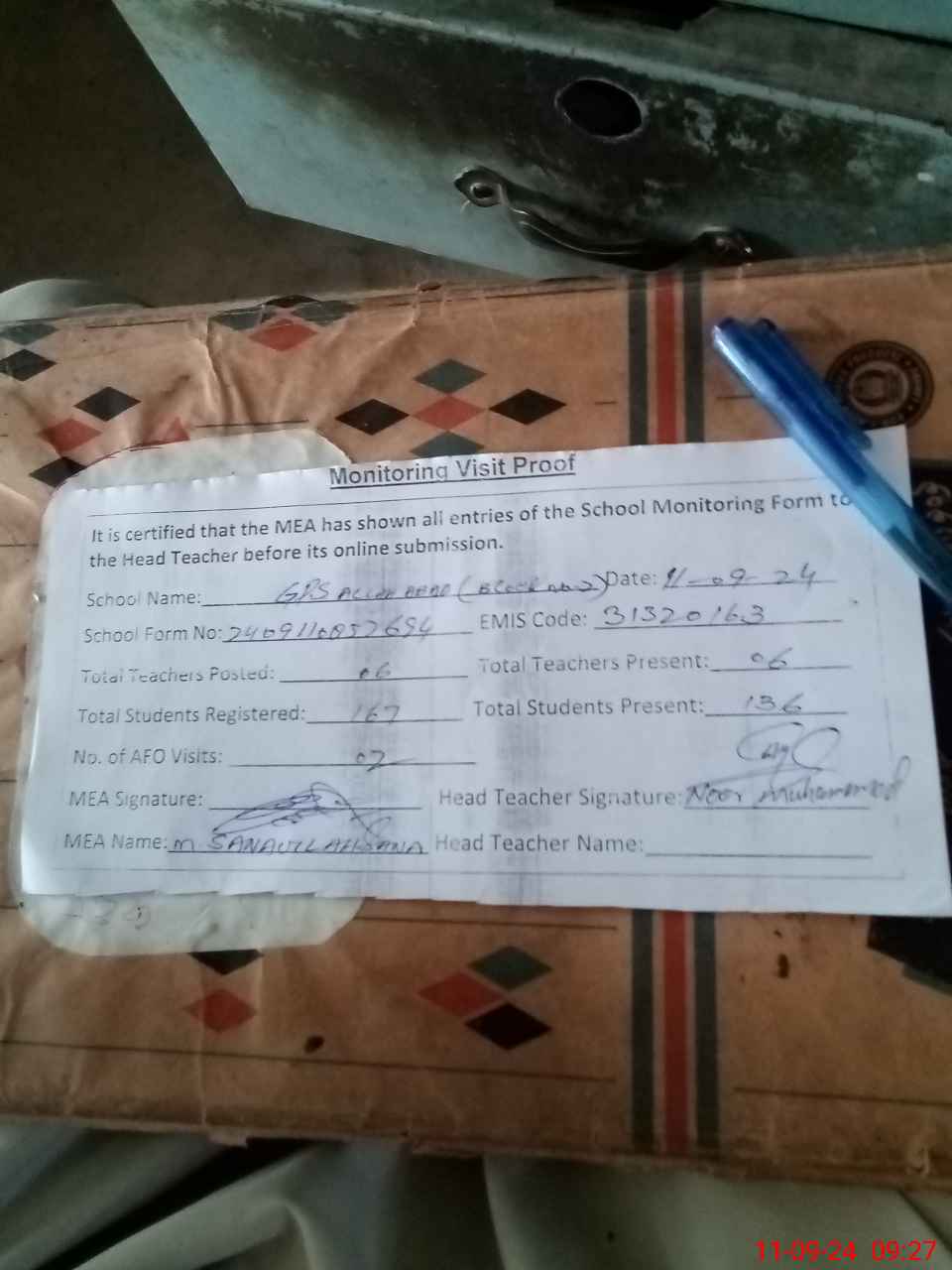 | Attendance Register | Head Teacher | MEA with School | Visit Proof |