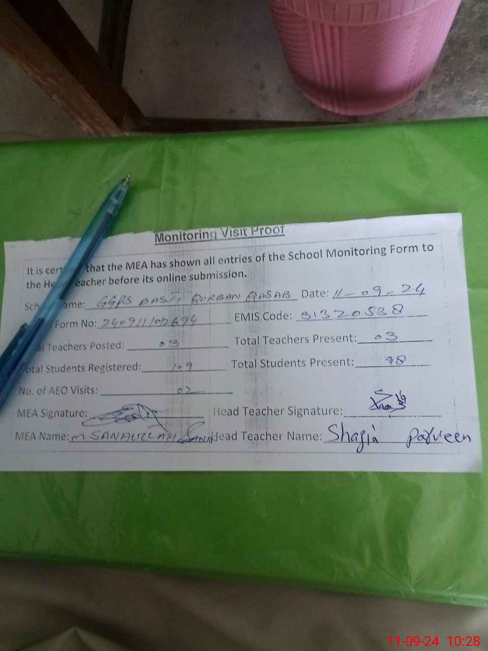 | Monitoring Date: 11-09-2024 | Start Time: 11-09-2024 10:12 AM | End Time: 11-09-2024 10:29 AM | Name of MEA: Mu**** Sa**** Ul**** Sa**** | |