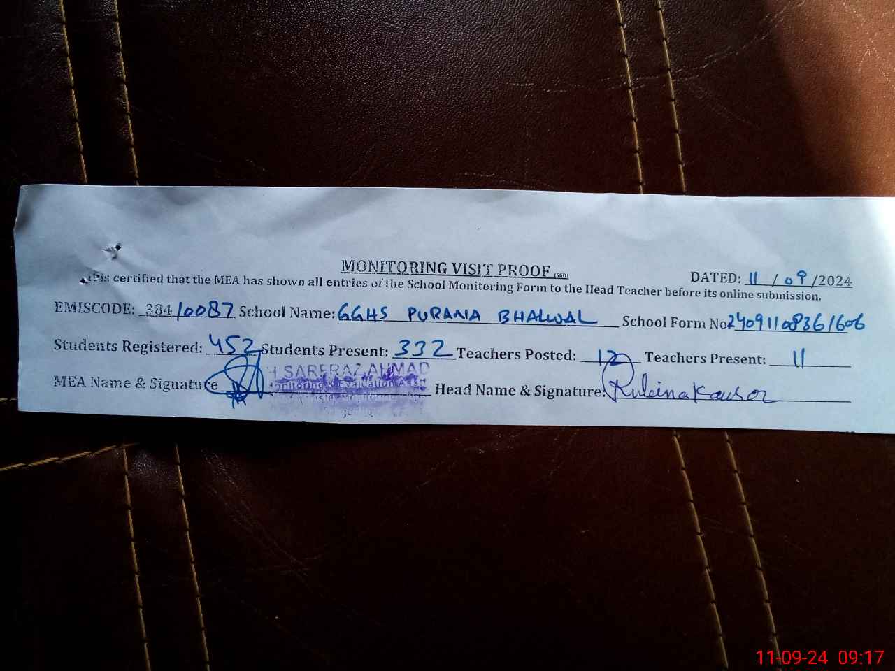 | EMIS Code: 38410087 | Name of School: GGHS PURANA BHALWAL | |||