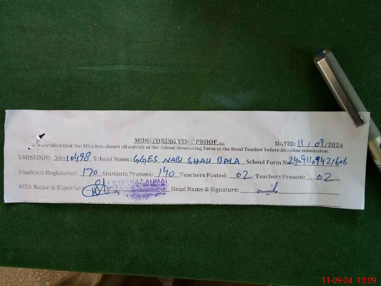 | Attendance Register | Head Teacher | MEA with School | Visit Proof |