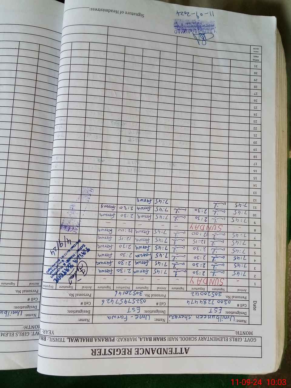 | Name: Um**** Bu**** Sh**** Designation: (School Headmaster's/Headmistress's) EST Phone/Cell Number: 03**** |