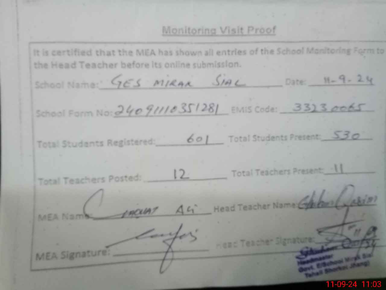 | Attendance Register | Head Teacher | MEA with School | Visit Proof |
