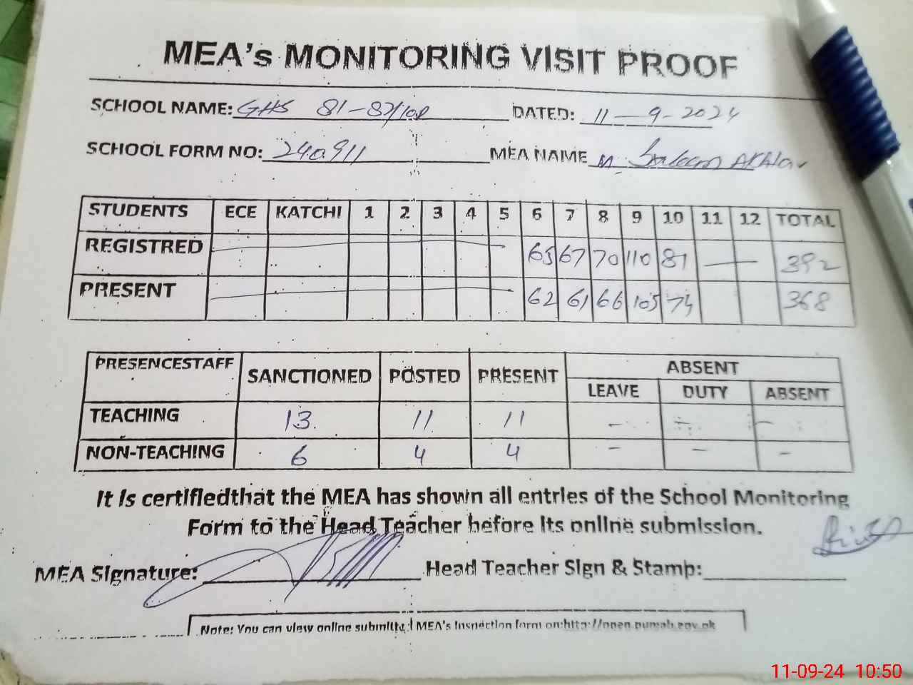 | Certified that this School was Inspected by the Undersigned MEA/DMO Today and the Information Stated Above is as Per Record. | |||||