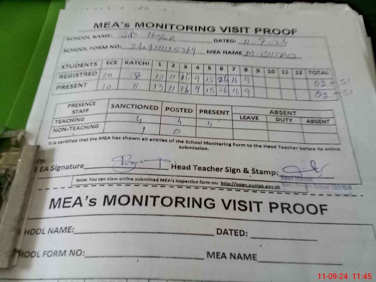 | Attendance Register | Head Teacher | MEA with School | Visit Proof |