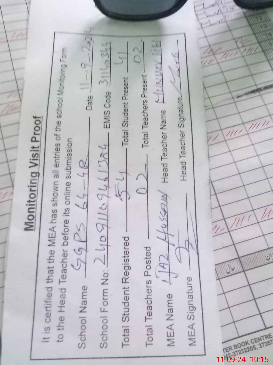 | Attendance Register | Head Teacher | MEA with School | Visit Proof |