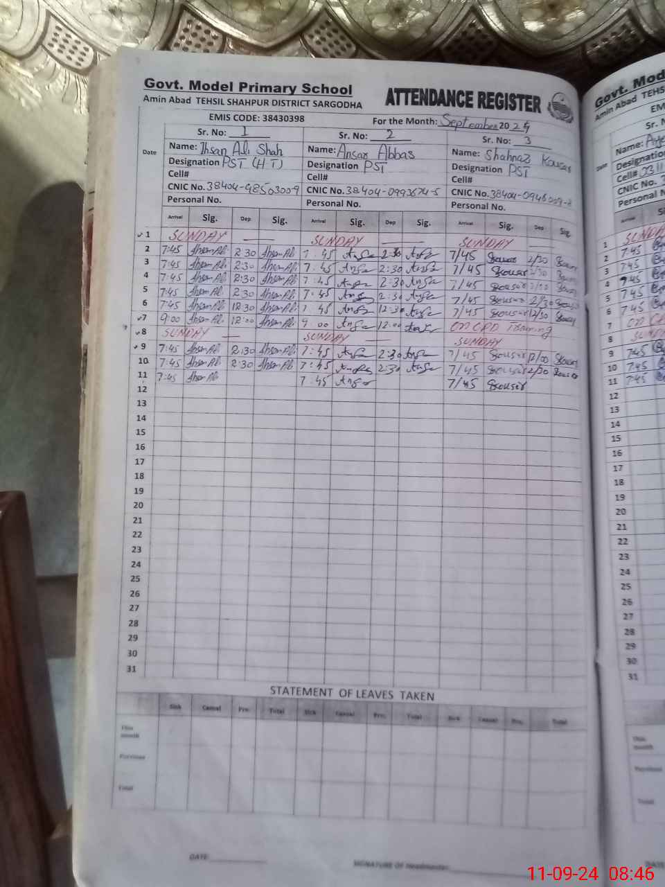 | CNIC | Full Name | Designation | R/C | Absence during last cal. month |