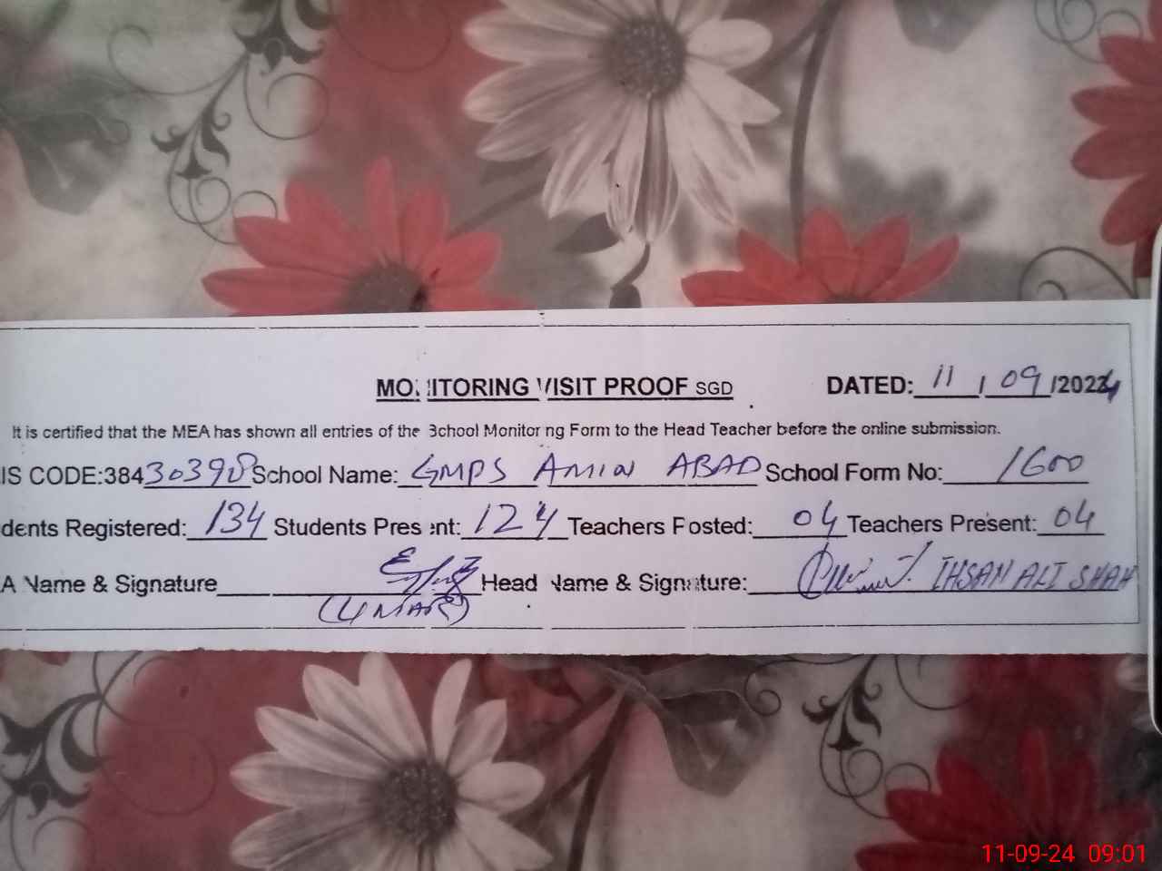 | Attendance Register | Head Teacher | MEA with School | Visit Proof |