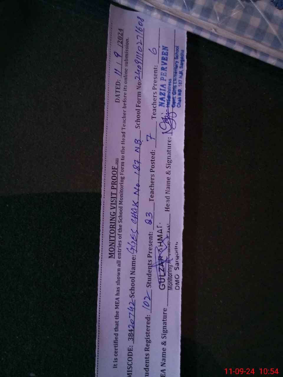 | Attendance Register | Head Teacher | MEA with School | Visit Proof |