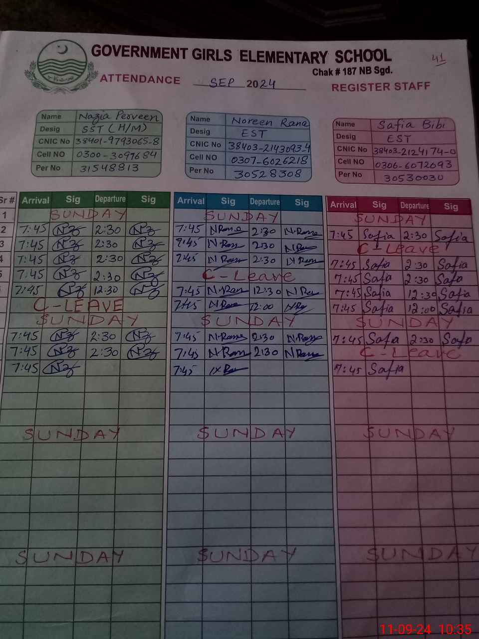 | CNIC | Full Name | Designation | R/C | Absence During Last Calender Month |