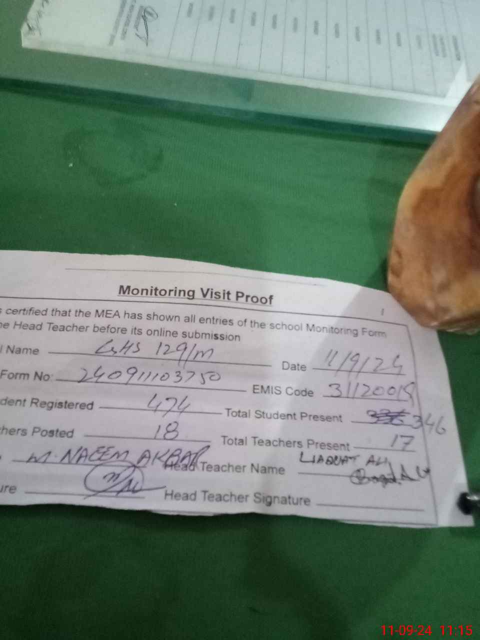 | Attendance Register | Head Teacher | MEA with School | Visit Proof |