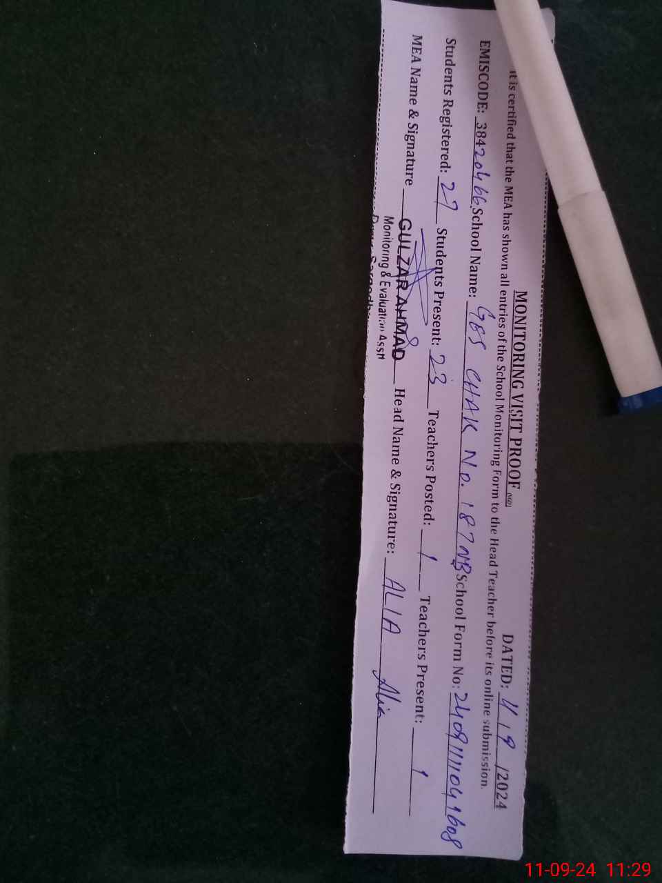 | Attendance Register | Head Teacher | MEA with School | Visit Proof |