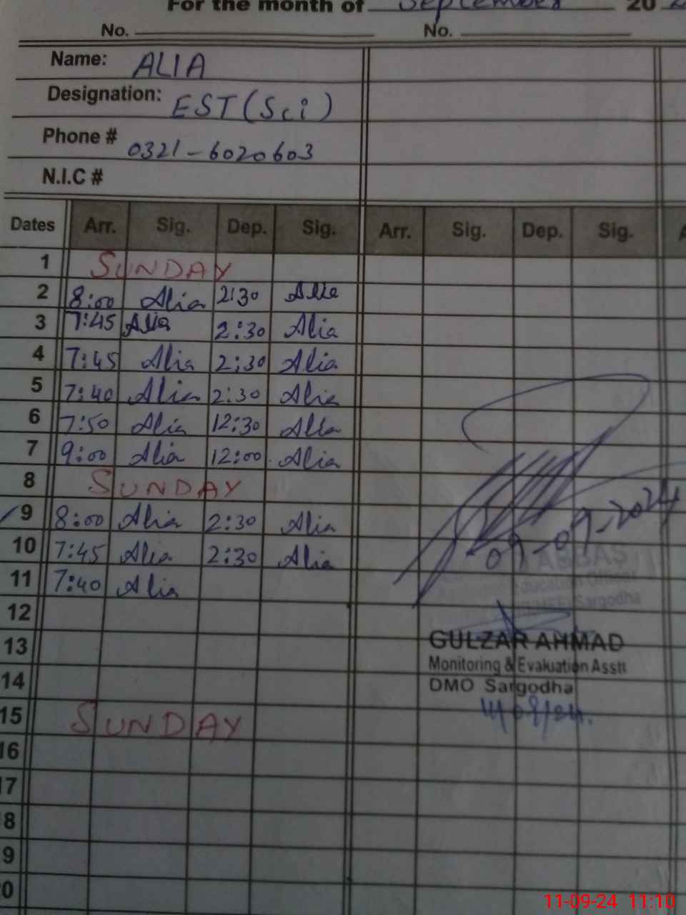 | Name: AL**** Designation: (School Headmaster's/Headmistress's) EST (GENERAL) Phone/Cell Number: 03**** |
