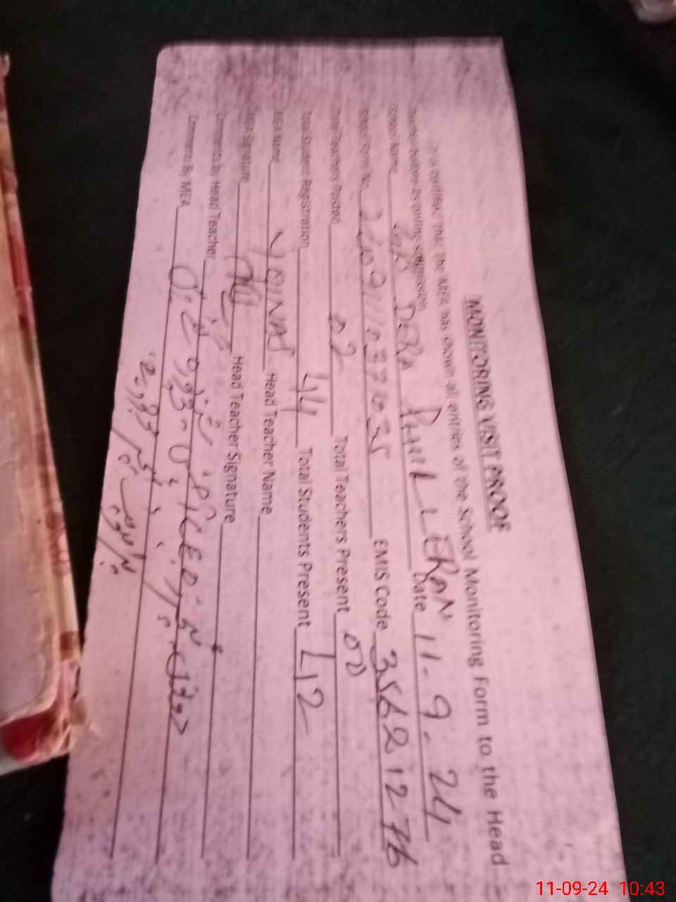 | Attendance Register | Head Teacher | MEA with School | Visit Proof |