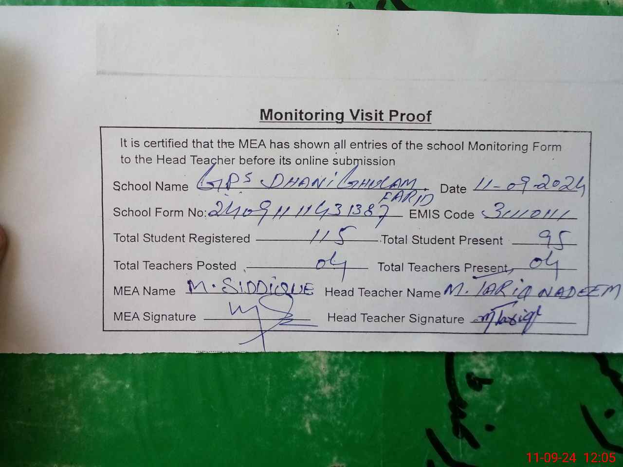 | Attendance Register | Head Teacher | MEA with School | Visit Proof |