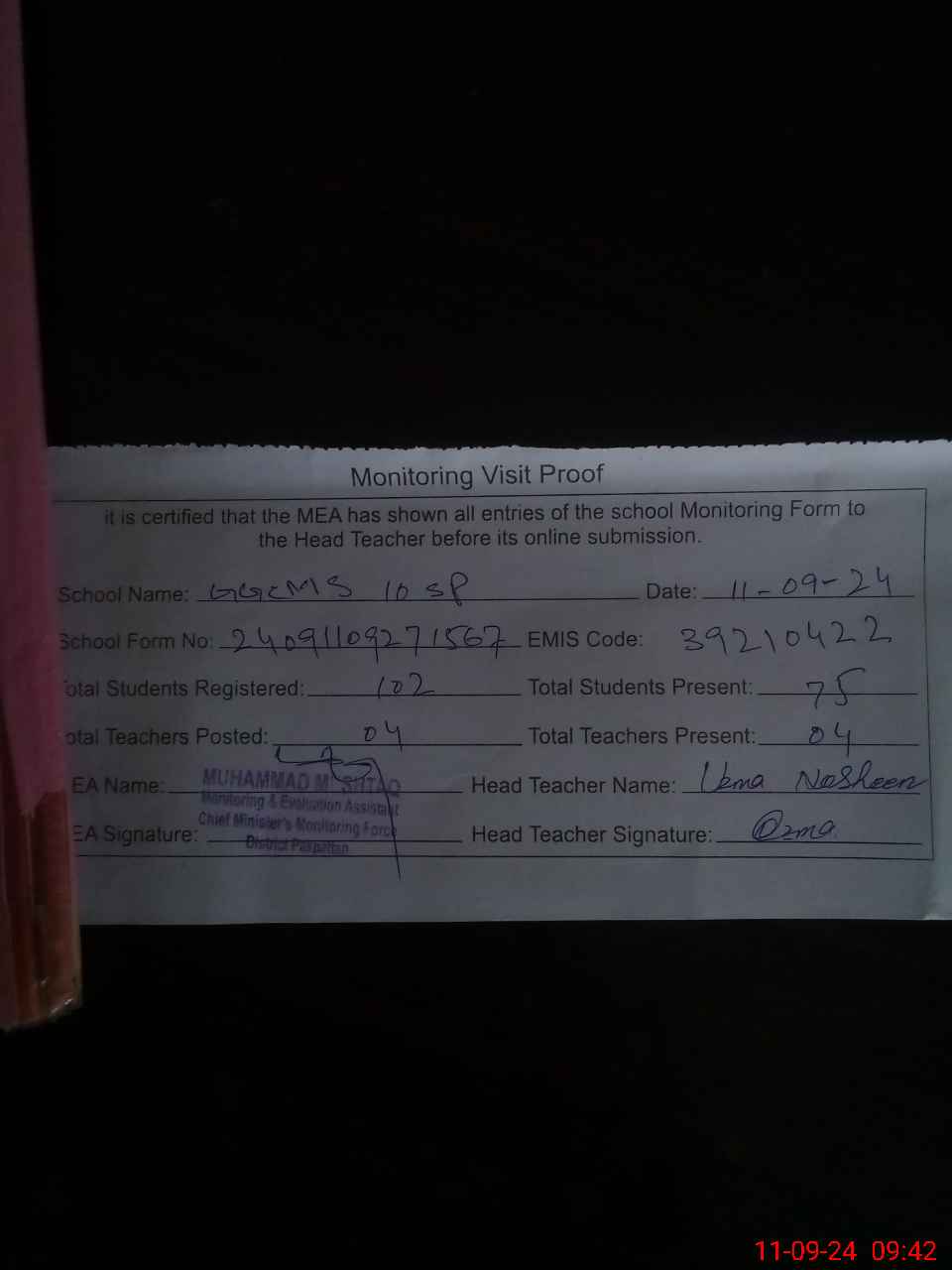 | Attendance Register | Head Teacher | MEA with School | Visit Proof |