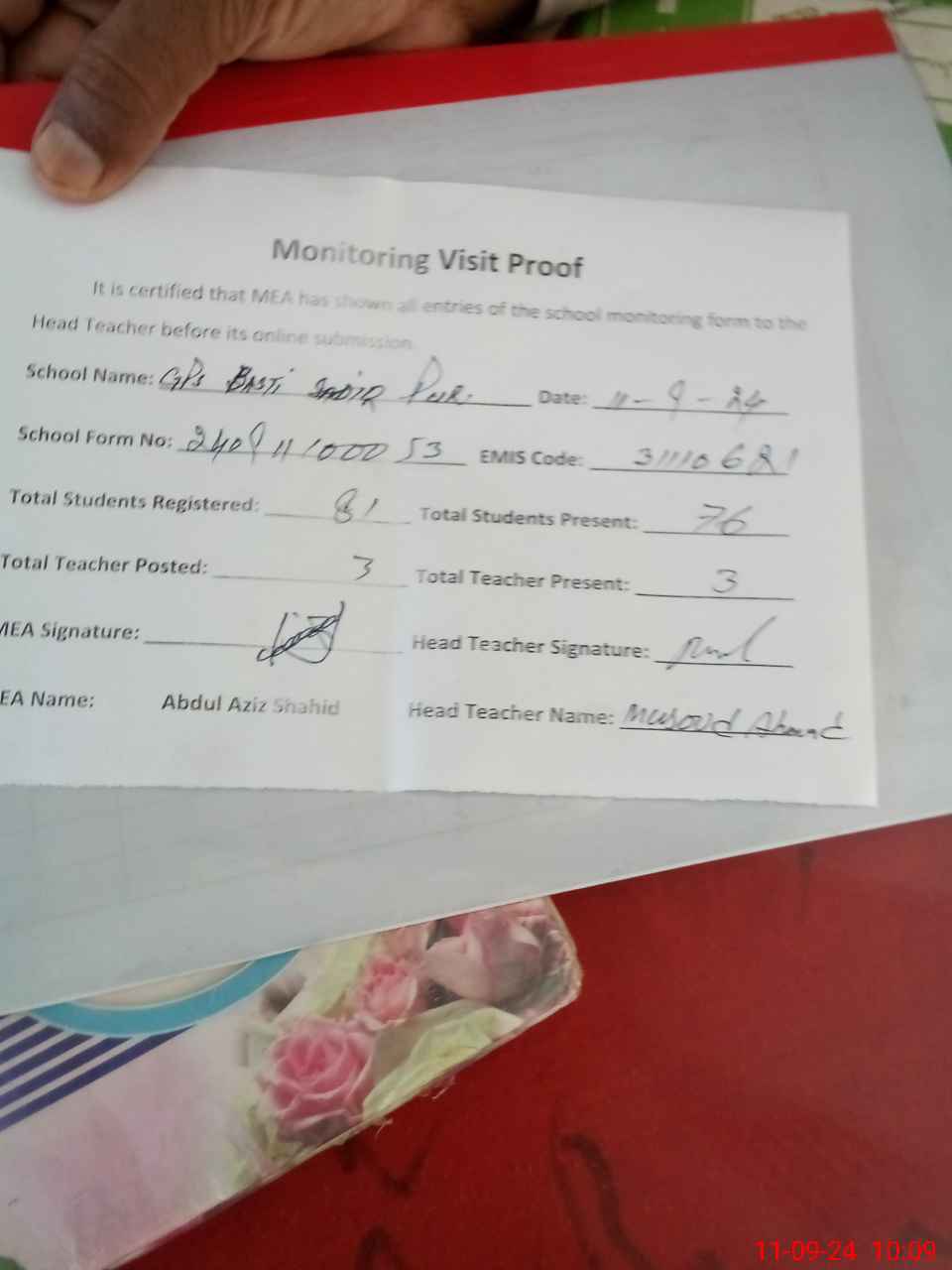| Certified that this School was Inspected by the Undersigned MEA/DMO Today and the Information Stated Above is as Per Record. | |||||